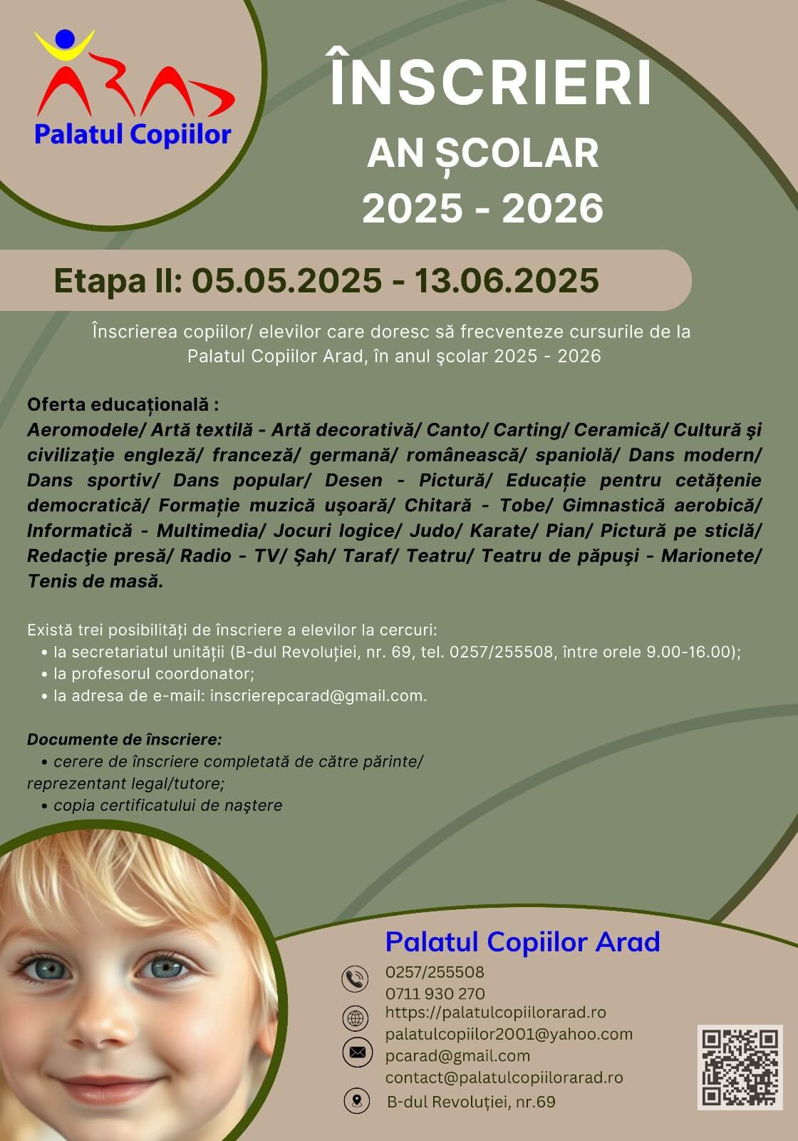 Palatul Copiilor și filialele – Clubul Copiilor Pecica și clubul Copiilor Sântana au dat startul înscrierilor pentru anul școlar 2025-2026. Fișele de înscriere se pot descărca de aici: Palatul Copiilor Arad Clubul Copiilor Pecica Clubul Copiilor Sântana Vă așteptăm cu drag!